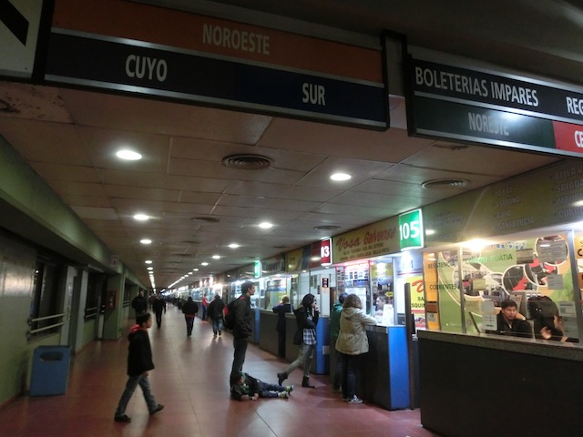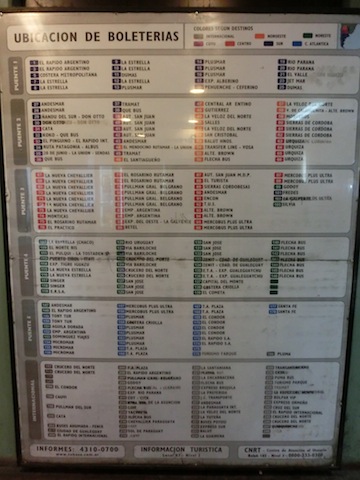 チリなど他国に行く国際バス、アルゼンチン北部方面、南部方面、など行き先によってチケット売り場が分かれています。(写真はチケット売り場の案内看板)