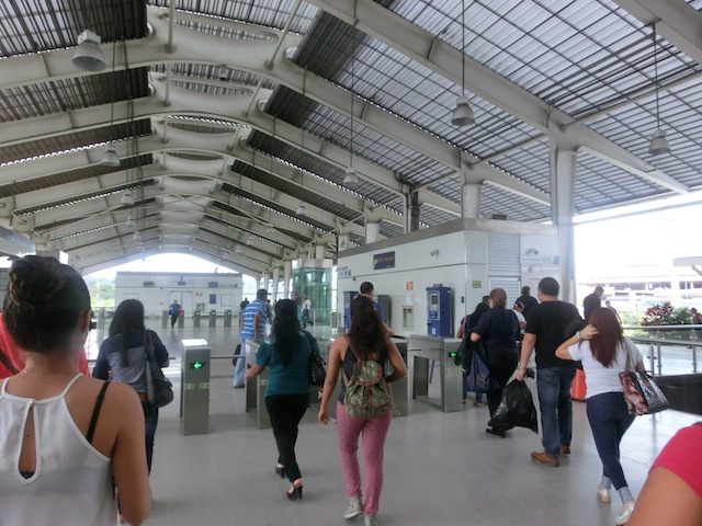 3: 地下鉄アルブロック駅からバスターミナルに向かい、ターミナルに入った正面にあるタクシーが止まっている道を右に曲がった所にバス乗り場があります。特に看板などはなく、ENTRADA E が見える場所です。(わかりにくいのですが、以下写真右がEが見える場所です)ミラフローレス と表示しているバスがやってきます。